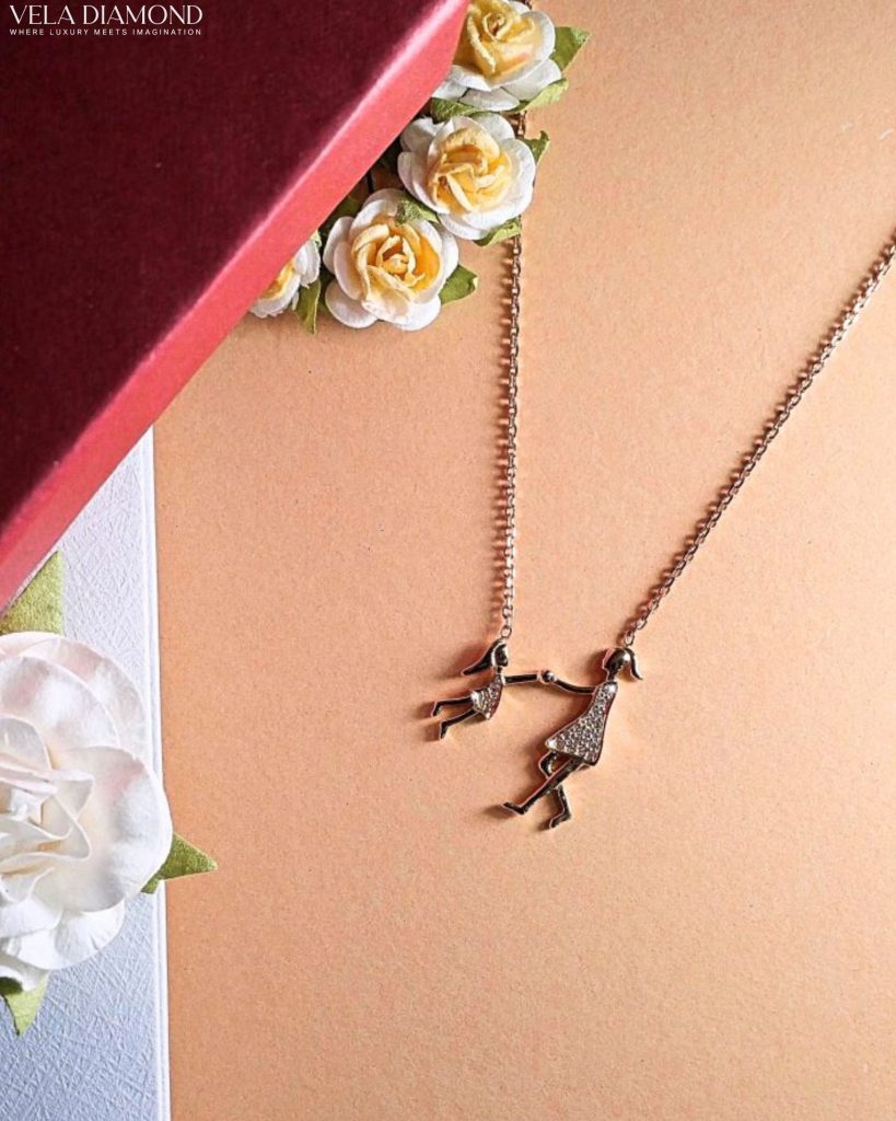 This minimalist diamond necklace captures the unbreakable bond between mother and child through the gentle image of two hands holding each other. A symbol of pure love and warmth, it’s a meaningful piece for any special occasion.