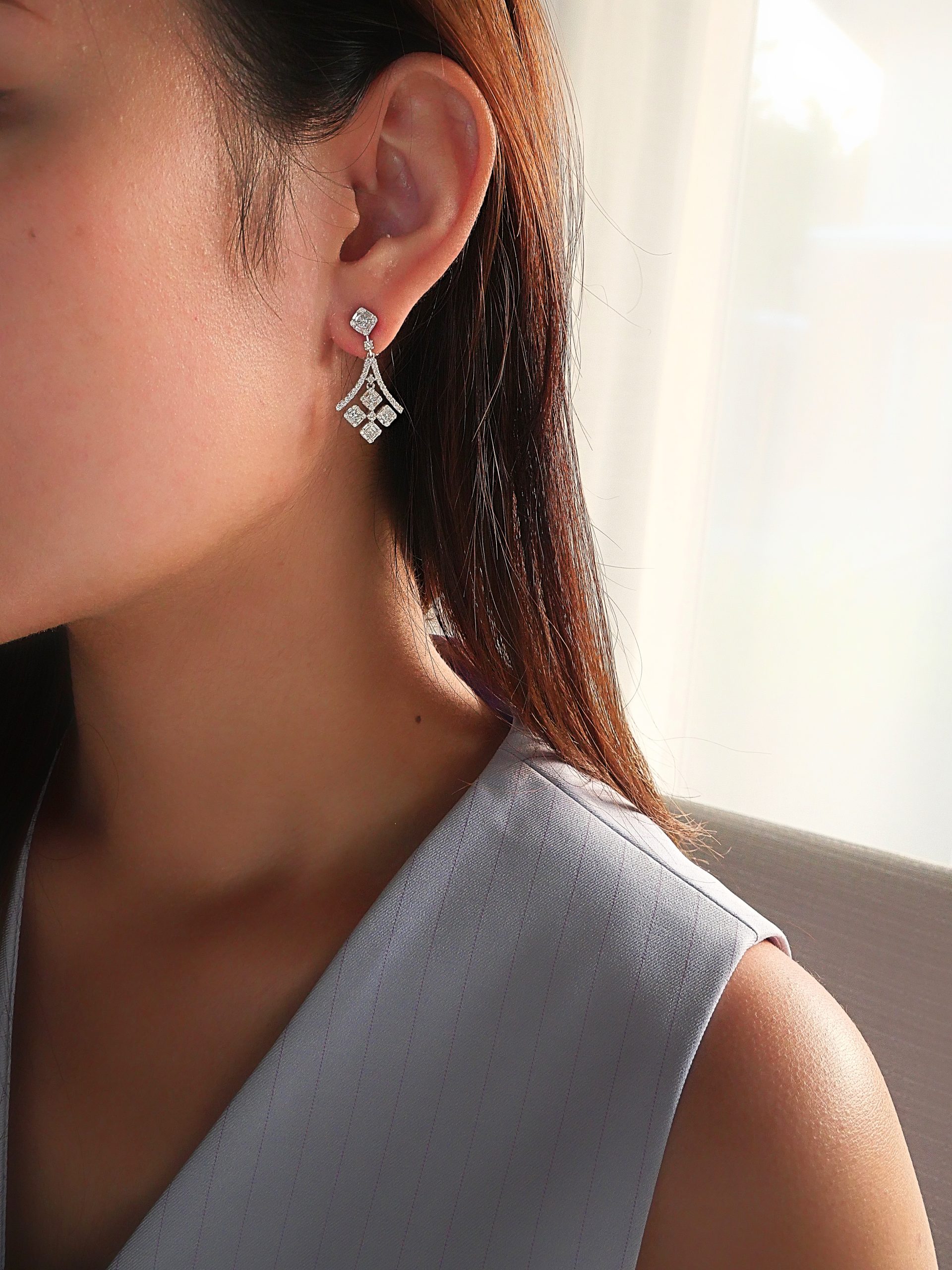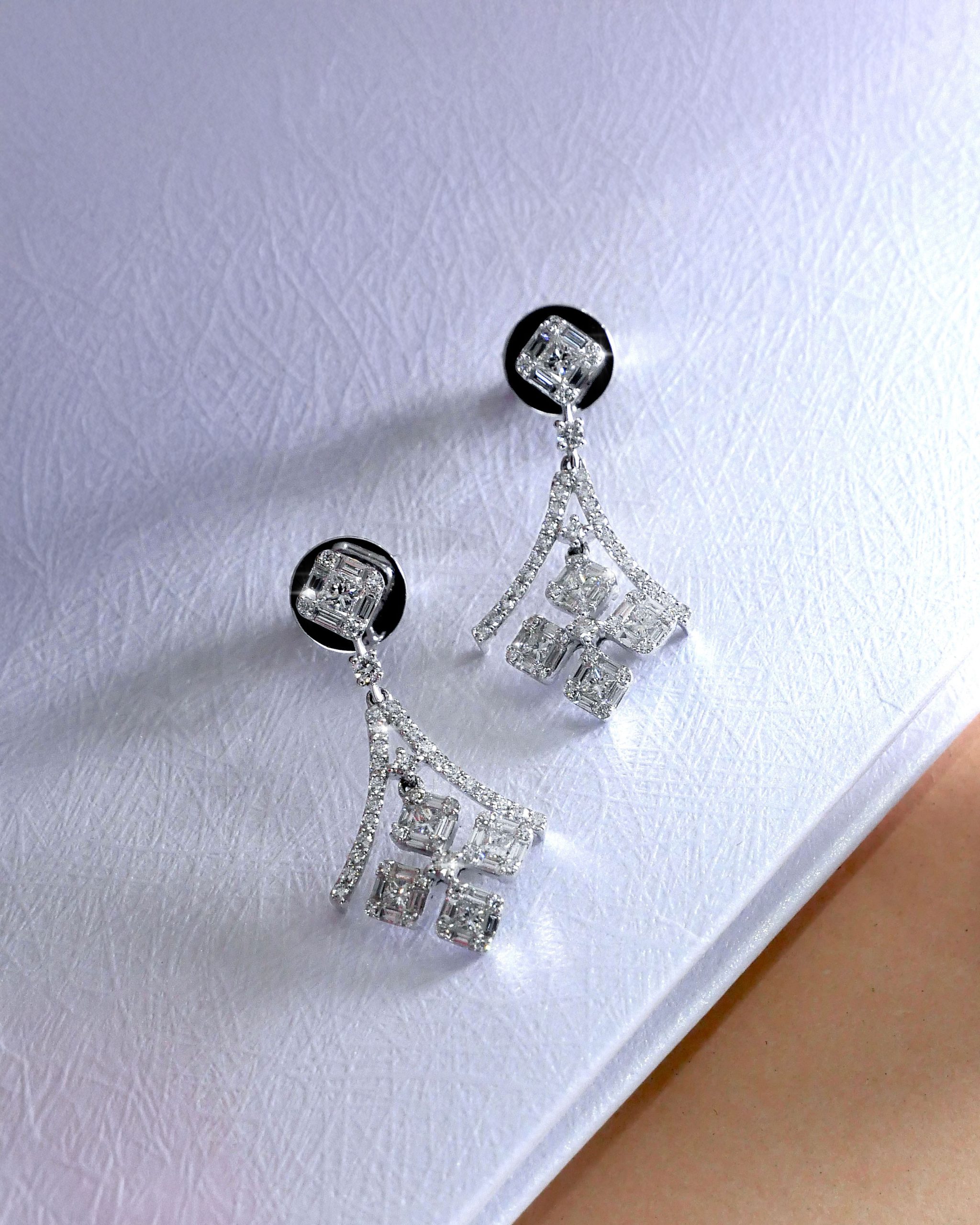 ต่างหูเพชรประกบเทียบเท่าเพชร Asscher 50 ตัง น้ำหนักรวม 1.57 กะรัต คัดเพชรขาวน้ำ 99-98 (E-F coloe) สวยระยิบระยับมาก เพชรสะอาด VVS-VS ออกแบบเป็นระย้า ใส่สวยเต็มหู ประกายเพชรที่ดูแน่นๆ อลังการมากค่า