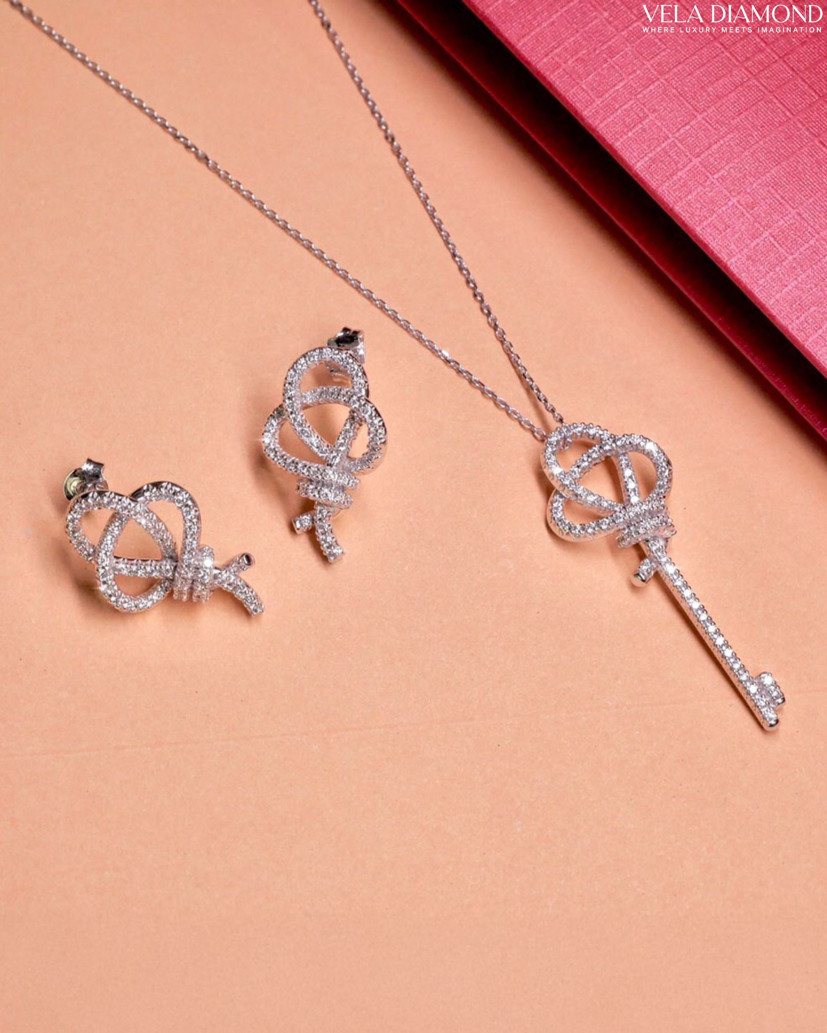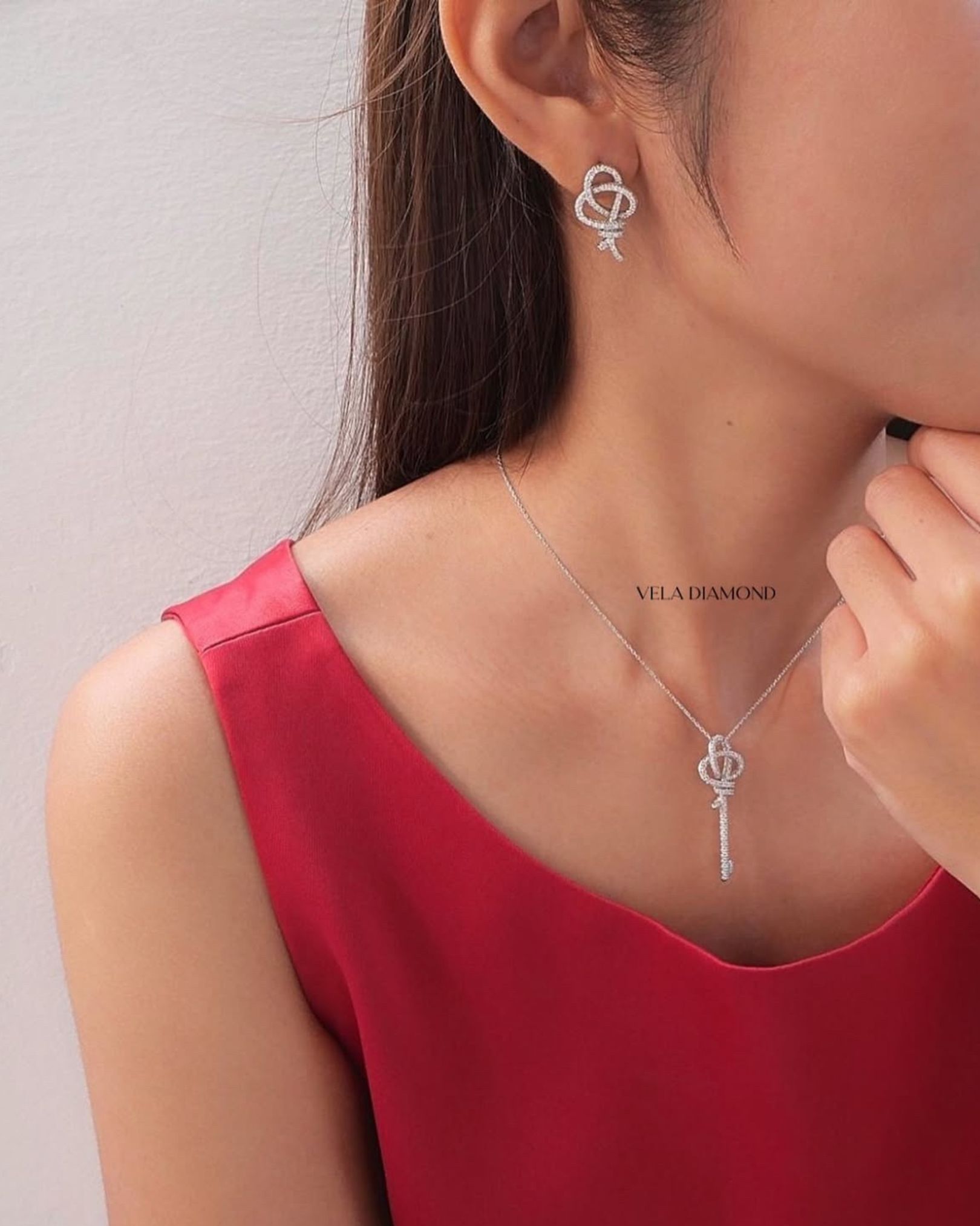 เครื่องประดับที่มีดีเทลน่ารักแต่ยังคงความ elegant ดีไซน์จี้รูป “กุญแจวินเทจ” ที่ดู symbolic และ timeless ตัวจี้ประดับเพชรระยิบระยับทั่วทั้งเรือน เล่นไฟดีมากกก จัดเต็มทุกองศา