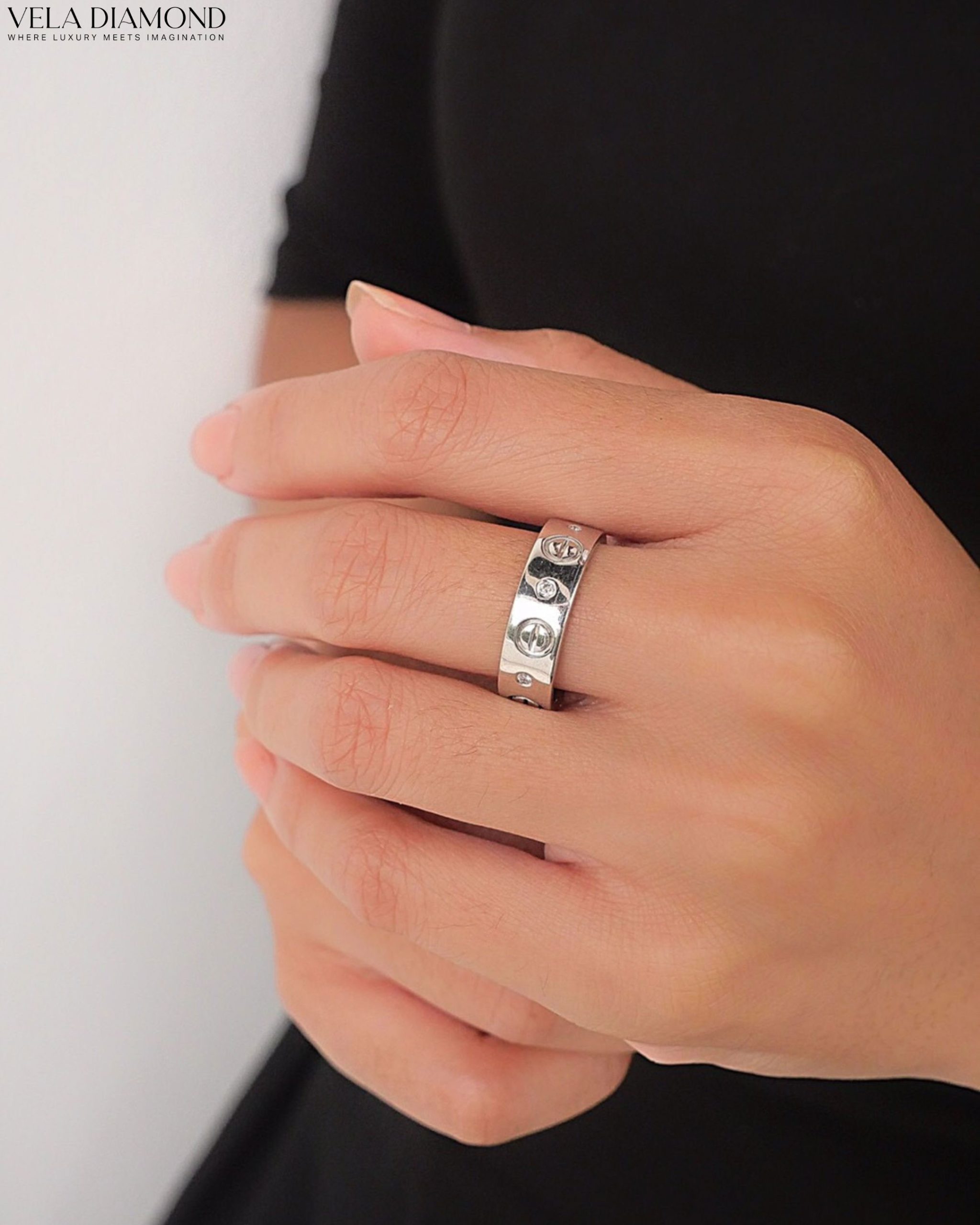 ตัวเรือนออกแบบให้เรียบเท่ พร้อมฝังเพชรกลม 6 เม็ดสลับกับลายสลักรูปวงกลม ดูเรียบหรู เหมาะทั้งใส่เดี่ยวหรือจะใส่เป็นแหวนคู่ก็ลงตัว