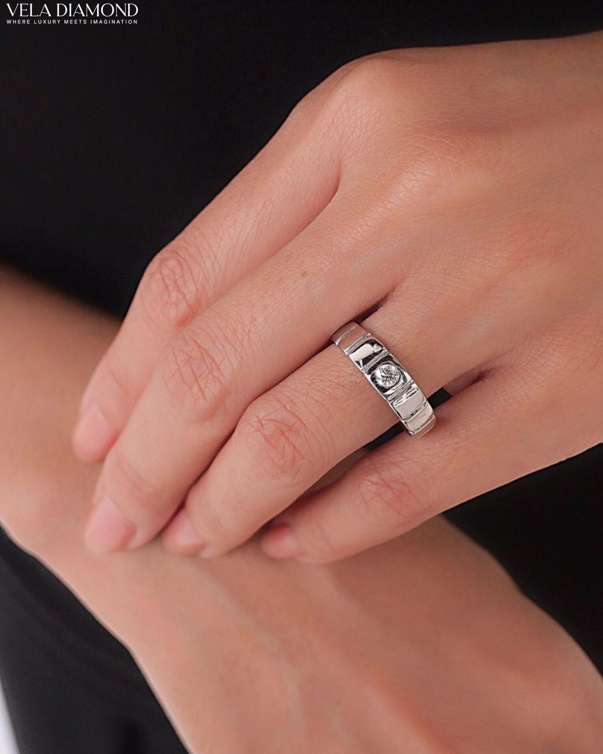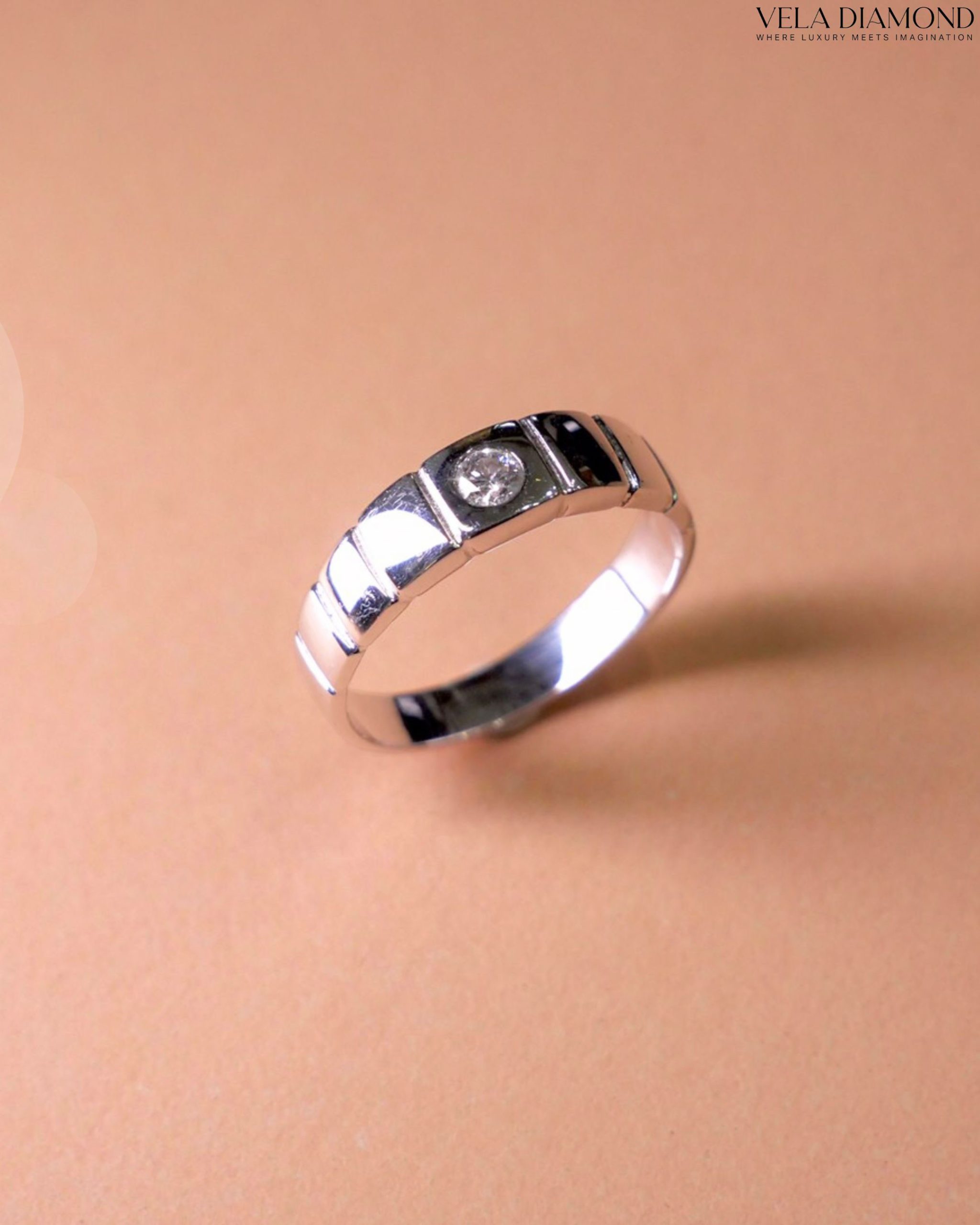แหวนเพชรดีไซน์เรียบหรู ที่ใส่ง่ายแต่มีดีเทลไม่ธรรมดา ตัวเรือนออกแบบมาให้ดูเรียบเท่ เสริมลูกเล่นด้วยลวดลายที่กลมกลืน พร้อมฝังเพชรเม็ดเดี่ยวอย่างประณีต