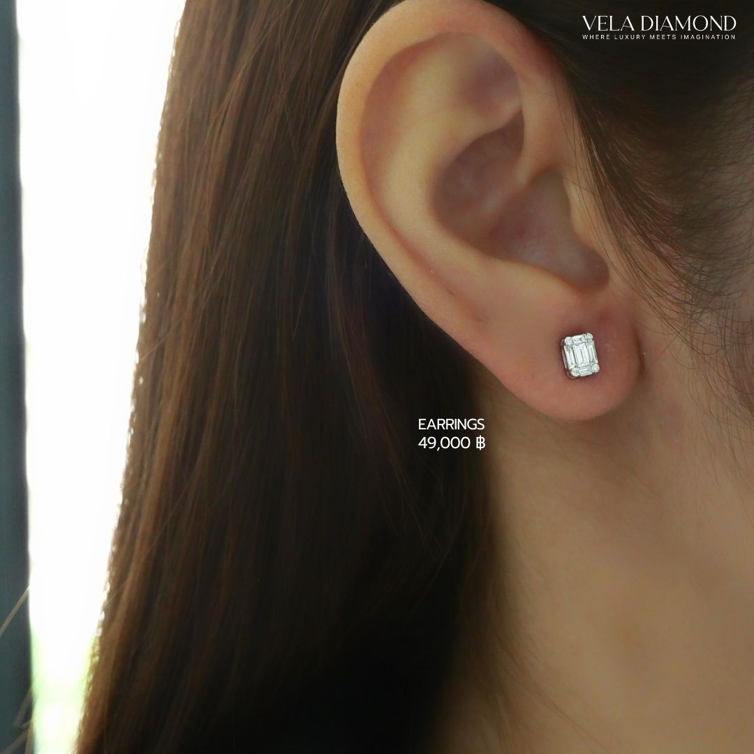 ต่างหูเพชรแท้ดีไซน์ Stud ที่ให้ลุคเรียบหรูแบบคลาสสิก ใส่ง่าย และดูดีได้ทุกวัน ดีไซน์ Illusion ช่วยขับหน้าเพชรทรง Emerald Cut ให้ดูโดดเด่น คมชัด และไม่ตกเทรนด์